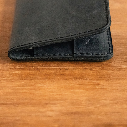 This slim card wallet features a simple two-panel layout, with card slots on both sides and a discreet strip for folded notes or select coins. It starts snug, then naturally stretches to fit your everyday carry.