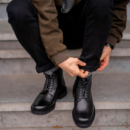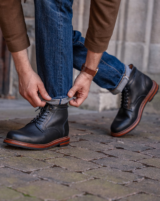Crafted in Europe with black fine calf leather and a rugged commando sole, these Goodyear welted boots are built to last. As an end-of-line style, only the final sizes remain—this exact color and style won’t return!