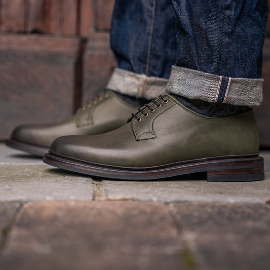 This pair features ‘Seaweed’ vintage calf — a soft, oiled leather with natural texture and subtle surface variation. Its muted green tone pairs seamlessly with the dark brown antique welt, adding quiet depth and character.