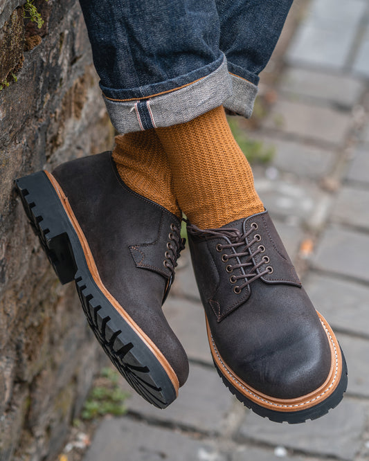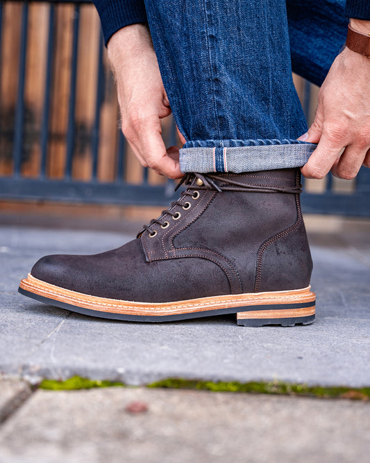 These Brawlers sport a rugged waxed leather upper. The color is a unique and beautiful 'Truffle': a greyish dark brown that flaunts greenish or reddish undertones depending on what light you're in. Finished on a raw welt and commando sole, we get a robust yet subtle, super versatile shoe.