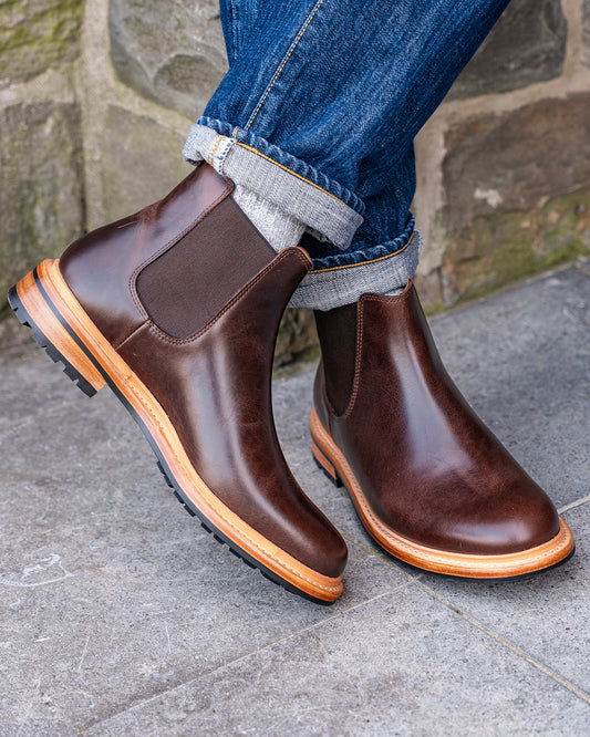 This pair features ‘Seaweed’ vintage calf — a soft, oiled leather with natural texture and subtle surface variation. Its muted green tone pairs seamlessly with the dark brown antique welt, adding quiet depth and character.