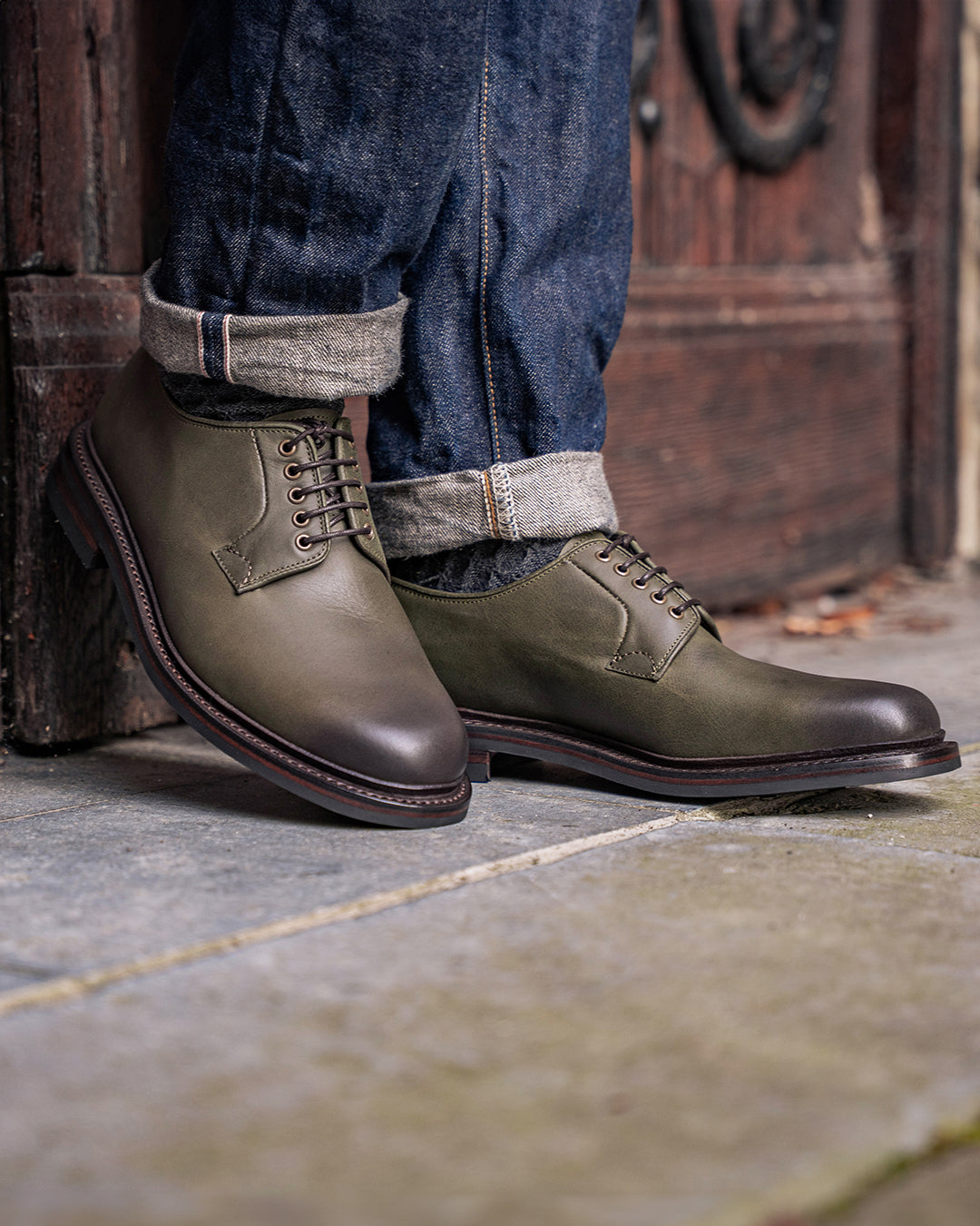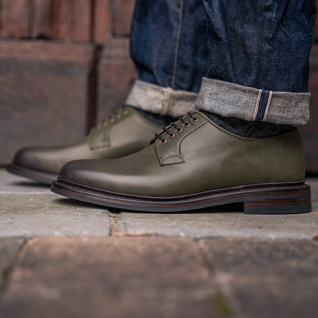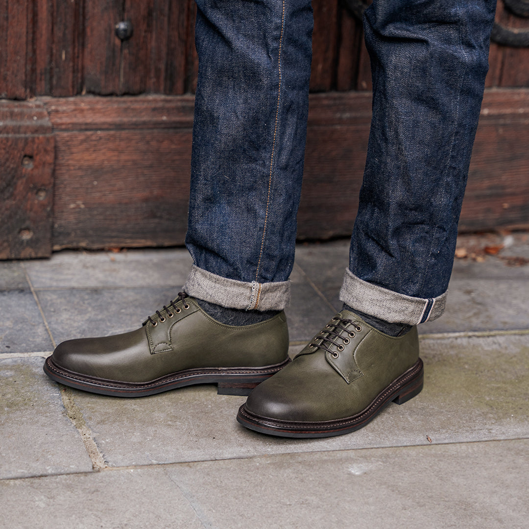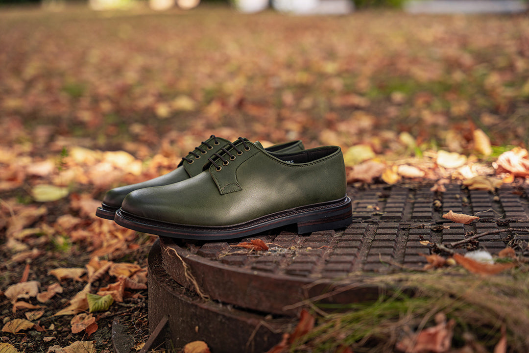 This pair features ‘Seaweed’ vintage calf — a soft, oiled leather with natural texture and subtle surface variation. Its muted green tone pairs seamlessly with the dark brown antique welt, adding quiet depth and character.