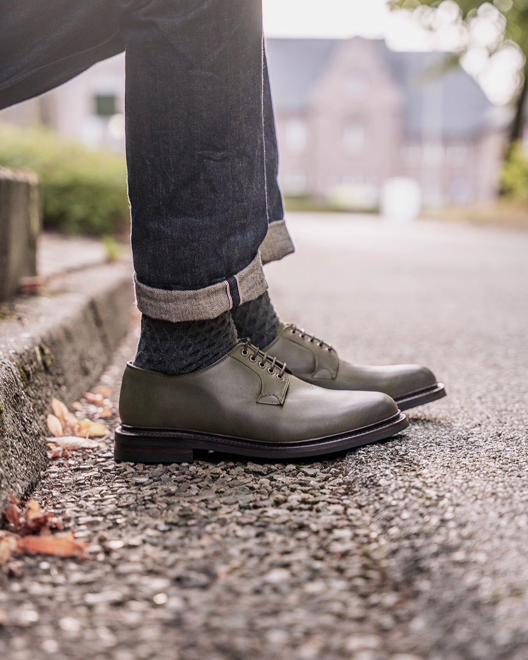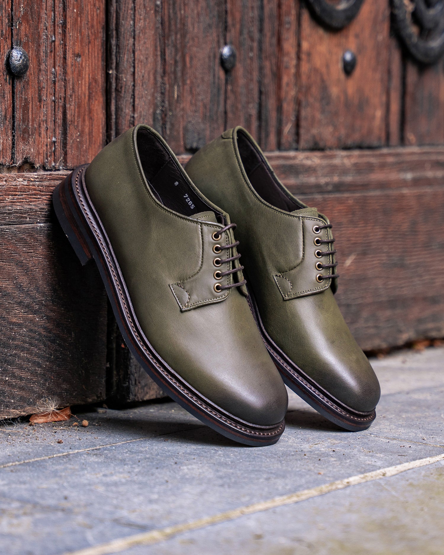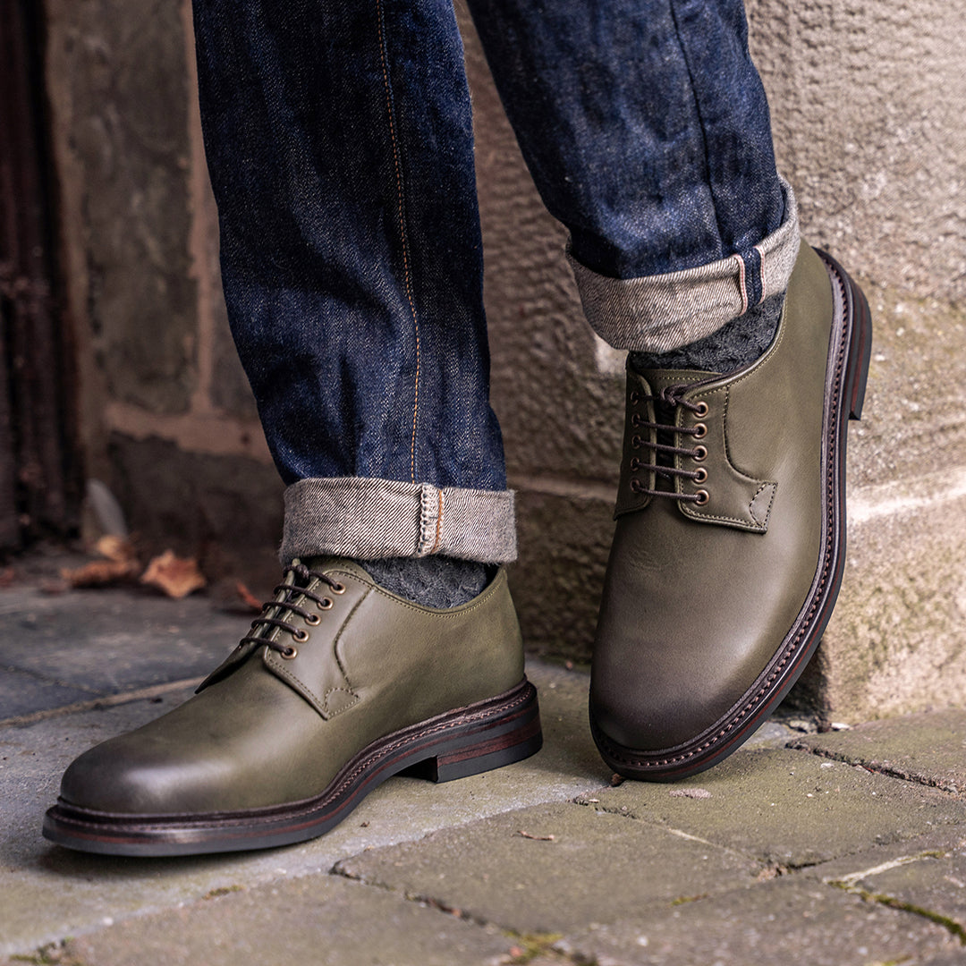 This pair features ‘Seaweed’ vintage calf — a soft, oiled leather with natural texture and subtle surface variation. Its muted green tone pairs seamlessly with the dark brown antique welt, adding quiet depth and character.