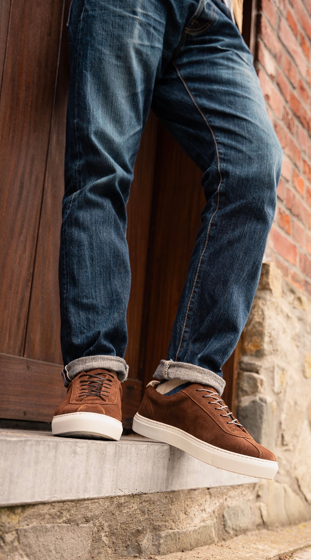 This is a classic 'trainer', crafted from a deep Nutmeg brown suede and stitched to a white sole.